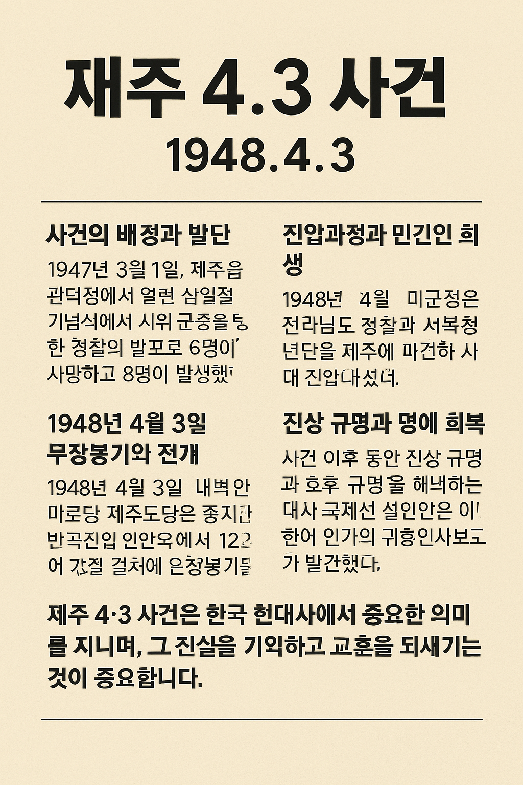 목차1. 들어가며2. 사건의 배경과 발단3. 1948년 4월 3일 무장봉기와 전개4. 진압과정과 민간인 희생5. 사건의 종결과 이후6. 진상 규명과 명예 회복7. 제주 4·3 사건의 교훈과 현대적 의미8. 결론참고 자료 및 추가 정보 1. 들어가며제주 4·3 사건은 한국 현대사에서 가장 가슴 아픈 비극 중 하나로 손꼽힙니다. 1947년 3월부터 1954년 9월까지 제주도 전역에서 발생한 이 사건은, 무장대와 진압대의 충돌 과정에서 수많은 제주도민들이 희생된 참혹한 역사입니다. 오랫동안 정확한 진상규명이 이루어지지 않았지만, 이후 다양한 노력과 증언, 기록을 통해 사건의 전말이 조금씩 밝혀졌습니다. 오늘날에는 제주 4·3 사건을 통해 한국 사회가 민주주의와 인권, 화해와 상생의 가치를 다시금 되새겨야 한다..